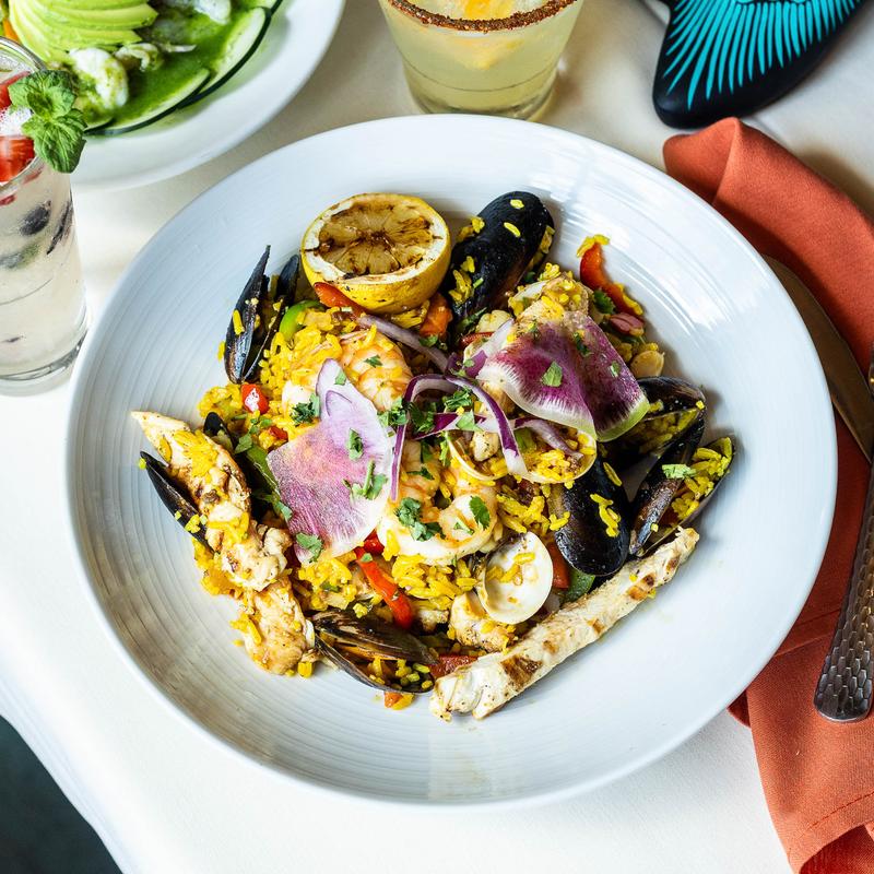 Our Mexican-style paella | Saffron rice, mussels, shrimp, octopus, bell peppers, Mexican chorizo, and tender chicken.