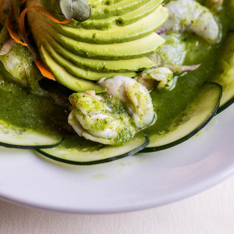 Raw | Fresh Shrimp cured in lime juice, avocado, red onion, jalapeno, cucumber, and aguachile verde sauce.